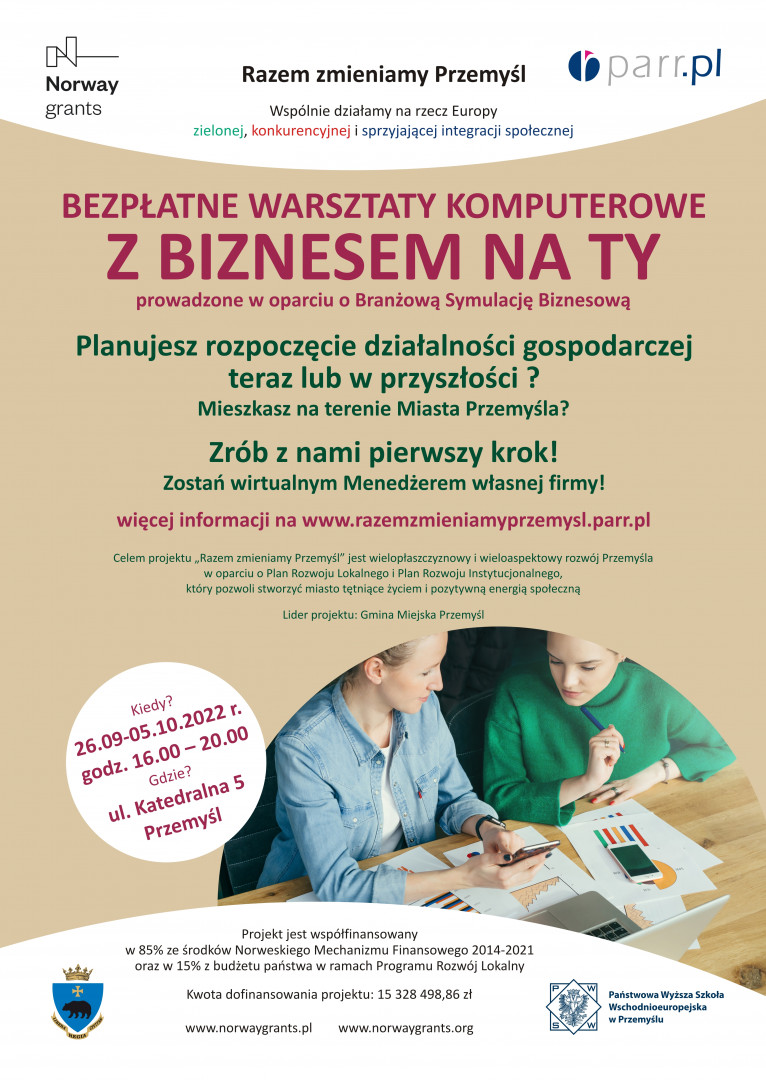 Udział w warsztatach moga wziąć wszystkie osoby planujące obecnie lub w przyszłości założenie działalności gospodarczej, których miejscem zamieszkania jest Miasto Przemyśl.
